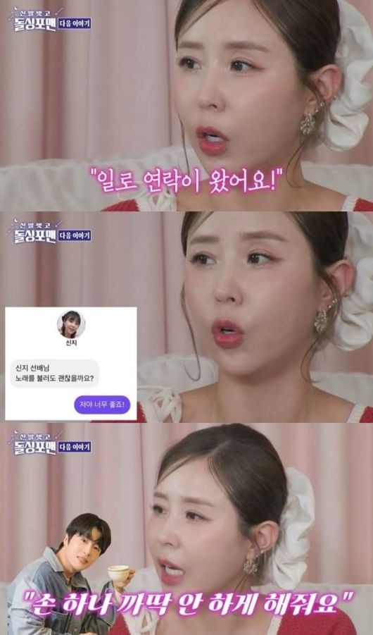 신지는 8일 SBS TV 돌싱포맨' 방송 말미 예고에서 '일곱살 연하의 미남은 어떻게 만났느냐'는 질문에 "(문원이) 일 때문에 DM으로 먼저 연락이 왔다"고 답했다. "'선배님 이 노래 커버해도 될까요?'라고 해 '저는 너무 좋죠'라고 했다"고 덧붙였다.