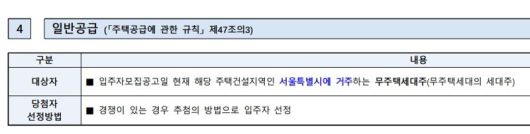 때문에 입주자모집공고일 현재 해당 주택건설지역(서울)에 거주하는 '무주택 세대주'만 청약할 수 있다. 재당첨 제한은 10년 이지만 전매제한 및 실거주의무는 없다.