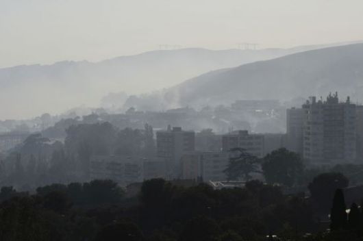 마르세유의 라 카스텔란 지역에서 산불이 발생해 건물 뒤에서 연기가 피어오르고 있다. AP연합뉴스. |
