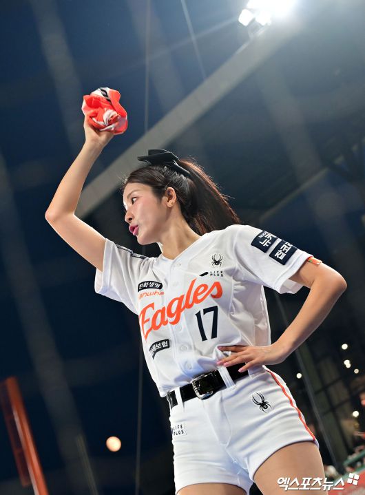 (엑스포츠뉴스 대전, 김한준 기자) 8일 오후 대전 한화생명 볼파크에서 열린 '2025 신한 SOL Bank KBO리그' KIA 타이거즈와 한화 이글스의 경기, 김연정 치어리더가 열띤 응원을 선보이고 있다.김한준 기자 kowel@xportsnews.com