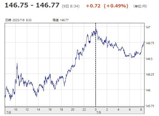 9일 외환시장에서 달러/엔 환율은 오전 8시 34분 현재 1달러=146.77엔 수준에서 움직이며 뚜렷한 엔화 약세를 보이고 있다.