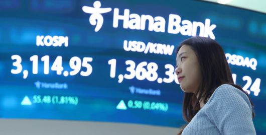 코스피가 3110대를 회복하며 장을 마감한 8일 서울 중구 하나은행 본점 딜링룸에 코스피, 코스닥지수 및 환율이 표시돼 있다. (사진=연합뉴스) |