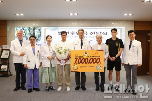 ▲광주FC(대표이사 노동일)가 8일 전남대학교병원(원장 정 신)에서 '폼폼푸린 유니폼 경매 기부금 전달식'을 진행하고 기념촬영을 하고 있다.2025.7.08ⓒ광주FC |