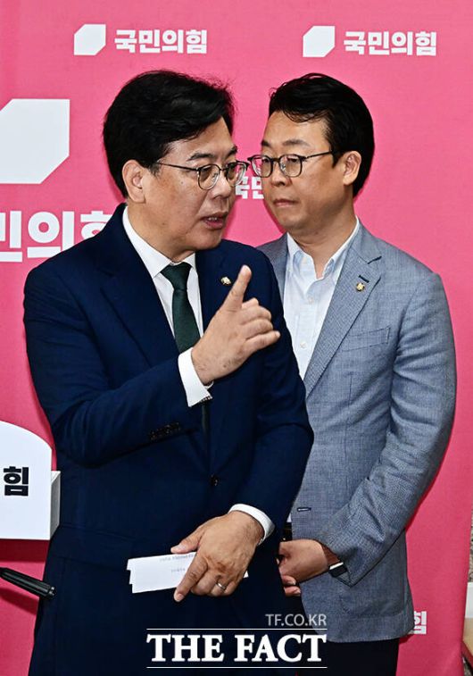 [더팩트ㅣ국회=배정한 기자] 송언석 국민의힘 비상대책위원장 겸 원내대표(가운데)가 9일 오전 서울 여의도 국회에서 열린 비상대책위원회의를 마친 뒤 취재진의 질문에 답변을 하고 있다.