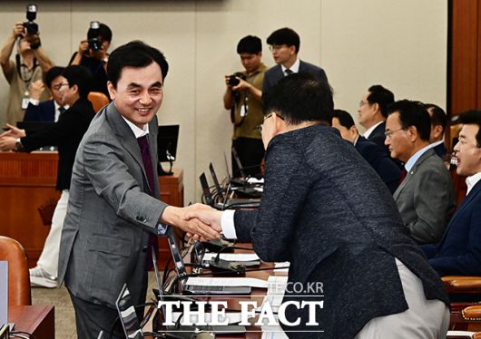 [더팩트ㅣ국회=배정한 기자] 국방부 장관 후보자로 지명된 안규백 더불어민주당 의원(왼쪽)이 9일 오전 서울 여의도 국회에서 열린 기획재정위원회 전체회의에 참석해 야당 의원들과 인사를 하고 있다.