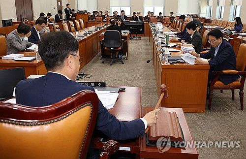 (서울=연합뉴스) 김주형 기자 = 9일 국회에서 열린 행정안전위원회 법안심사제2소위원회에서 국민의힘 소속 서범수 소위원장이 의사봉을 두드리고 있다. 2025.7.9