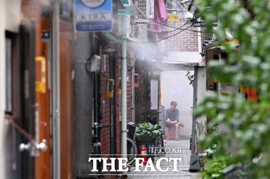 지난 2일 오후 서울 종로구 돈의동 쪽방촌 골목에 쿨링포그가 가동되고 있다. /서예원 기자 |