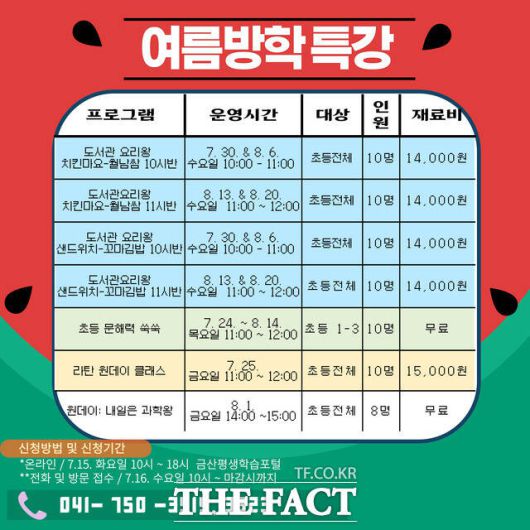[더팩트ㅣ금산=이정석 기자] 충남 금산군립도서관(기적·진산·추부)은 오는 24일부터 8월 20일까지 지역 내 어린이를 대상으로 여름방학 프로그램을 운영한다고 9일 밝혔다.