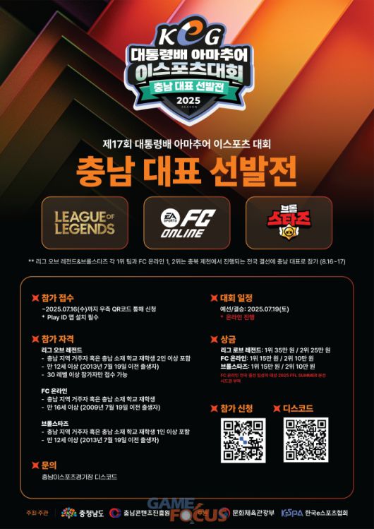 충청남도와 (재)충남콘텐츠진흥원(원장 김곡미)은 제17회 대통령배 아마추어 e스포츠 대회(‘대통령배KeG’) 충남 대표 선발전을 개최한다고 밝혔다. 이번 대회는 충남 지역의 우수 아마추어 e스포츠 인재를 발굴하고, 전국 결선에 충남을 대표하여 진출할 선수들을 선발하는 중요한 자리로 마련되었다.