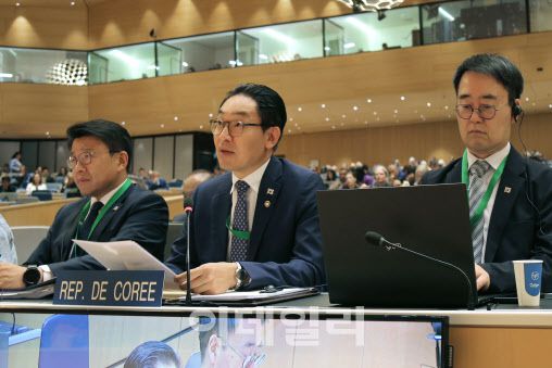 김완기 특허청장(가운데)이 스위스 제네바에서 열린 ‘제66차 세계지식재산기구(WIPO) 총회’에 참석해 대표연설을 하고 있다. (사진=특허청 제공) |