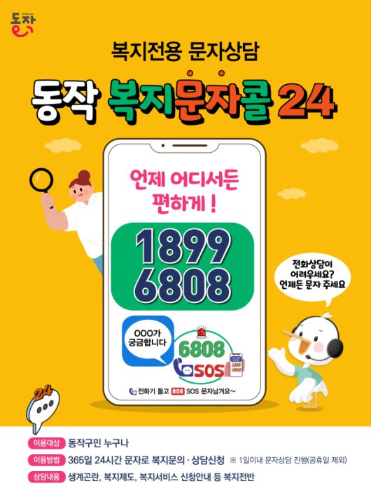 동작구는 전화 부담 없이 문자 한 통으로 복지 상담을 받을 수 있는 ‘복지문자콜 24’ 서비스로 큰 호응을 얻고 있다고 9일 밝혔다.