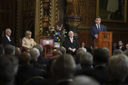 8일(현지시간) 영국을 방문한 에마뉘엘 마크롱 프랑스 대통령이 런던 웨스트민스터궁의 영국 의회에서 연설을 하고 있다.AP연합뉴스 |