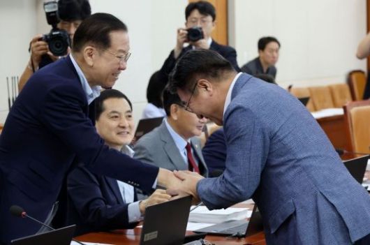 9일 국회에서 열린 기획재정위원회 전체회의에 윤호중 행안부 장관 후보자가 권영세 국민의힘 의원과 인사하고 있다. <ⓒ투자가를 위한 경제콘텐츠 플랫폼, 아시아경제(www.asiae.co.kr) 무단전재 배포금지>