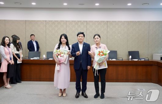 9일 새만금개발청 에서 칭찬주인공으로 선정된 최은경 주무관(왼쪽)과 최희정 주무관(오른쪽)이 김경안 청장과 기념 촬영을 하고 있다.(새만금개발청 제공)/뉴스1 |
