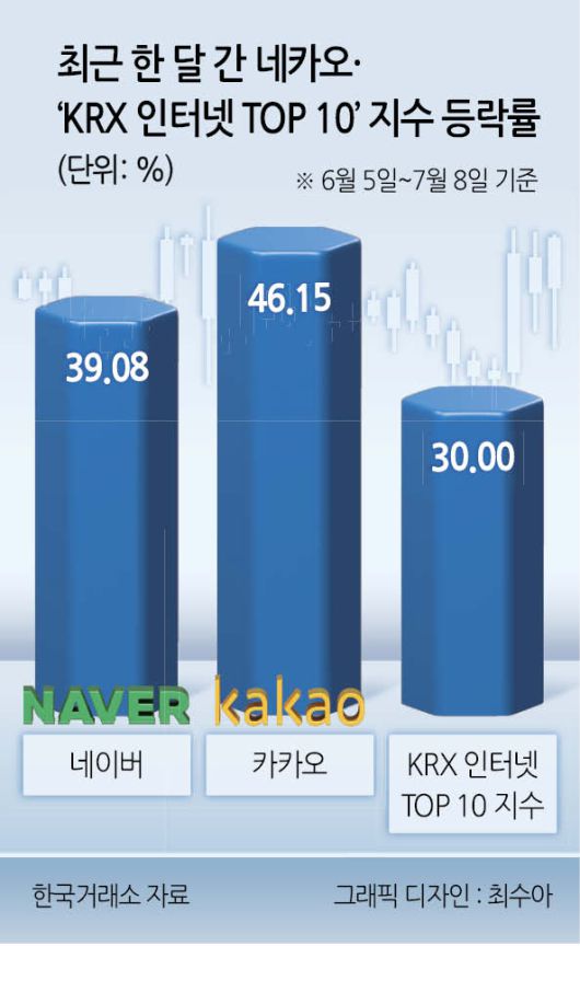 네카오(네이버+카카오) 주가가 수년 만에 찾아온 ‘정책 모멘텀’을 타고 고공 행진 중이다. 최근 한 달간 네카오가 이끄는 ‘KRX 인터넷 톱10’ 지수는 국내 증시 전체 지수 가운데 수익률 1위를 기록했다.