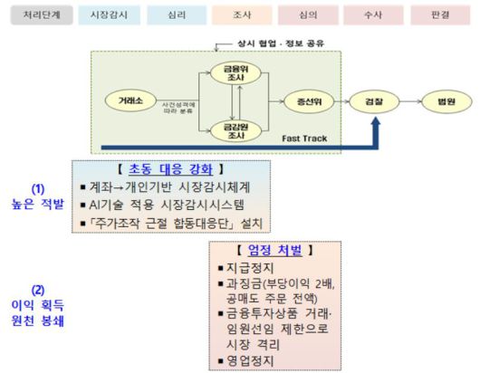 정부는 이미 올해부터 단계적으로 도입된 행정제재 수단을 적극 활용해 불공정거래 행위자를 자본시장에서 퇴출시킨다는 방침이다. 구체적으로는 혐의계좌에 대한 지급정지(최장 1년), 과징금 부과(최대 부당이득의 2배), 금융투자상품 거래 및 임원선임 제한명령(최장 5년) 등 3대 수단이 있다. 조사 초기 단계에서 계좌를 동결하고, 중대 사건은 외부에 적극 공표해 경각심을 높이기로 했다.
