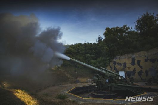 [진먼=AP/뉴시스] 23일(현지시각) 대만 진먼에서 연례 한광 훈련이 열려 대만 군인들이 240㎜ M1 곡사포를 발사하고 있다. 중국군의 침공에 대비한 대만 최대 훈련인 '한광 40호' 훈련이 22일 시작해 26일까지 이어진다. 2024.07.23. |
