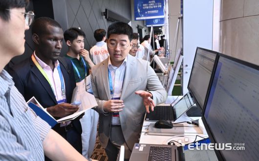 제14회 정보보호의 날 기념식이 9일 서울 용산구 서울드래곤시티호텔에서 열렸다. 해외 참가자들이 엘에스웨어의 통합 모듈형 서버 보안 및 관리 솔루션 등에 대한 설명을 듣고 있다. 박지호기자 jihopress@etnews.com [Copyright © 전자신문. 무단전재-재배포금지]