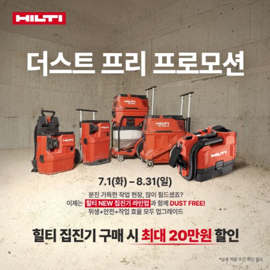 힐티코리아 관계자는 “이번 프로모션은 힐티의 집진 솔루션을 경험하고, 현장에서의 분진을 보다 효과적으로 관리할 수 있도록 기획됐다”라며 “시공 전문 고객들이 힐티 공식 홈페이지 ‘힐티온라인’ 가입을 통해 더욱 간편하게 혜택을 누리기를 바란다”고 밝혔다.