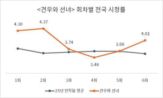tvN 월화드라마 '견우와 선녀'가 6화에서 전국 가구 기준 시청률 4.0%를 기록하며 케이블과 종편을 포함한 동시간대 1위에 올랐다. 수도권 기준 시청률은 평균 3.9%, 최고 5.1%였다.