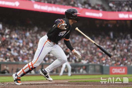 [샌프란시스코=AP/뉴시스] 샌프란시스코 자이언츠의 이정후가 8일(현지 시간) 미 캘리포니아주 샌프란시스코 오라클 파크에서 열린 2025 메이저리그 필라델피아 필리스와의 경기 2회 말 1루 주자 마이크 야스트렘스키를 3루까지 보내는 우전 안타를 치고 있다. 야스트렘스키는 윌 스미스의 적시타로 득점했다. 2025.07.09. |