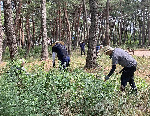 (강릉=연합뉴스) 최수천 동부지방산림청장(오른쪽)이 9일 폭염 속 현장 근로자의 애로사항을 확인하고 폭염 작업 관리의 중요성을 강조하기 위해 강원 양양군 조산도시숲에서 현장 근로자와 함께 야외작업 하루 체험을 하고 있다. 2025.7.9 [동부지방산림청 제공. 재판매 및 DB 금지]