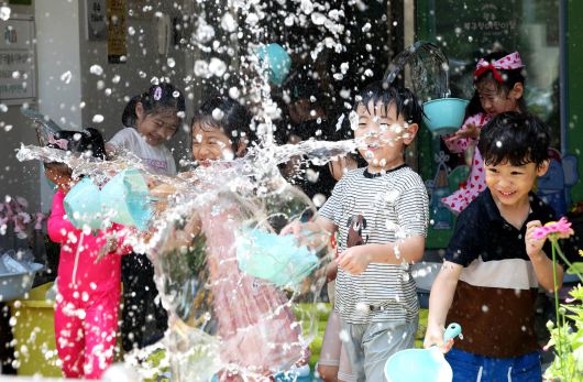 어린이집 앞마당에서 아이들이 교사와 물총놀이를 하며 더위를 식히고 있다. /뉴스1 |