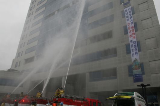 광주서부소방서에 따르면 9일 낮 12시 32분쯤 광주시 서구 치평동 15층 규모 복합건축물인 타임스퀘어 10층에서 불이났다. 2015년 재난대비 긴급구조종합훈련 자료사진. /광주시소방본부 |
