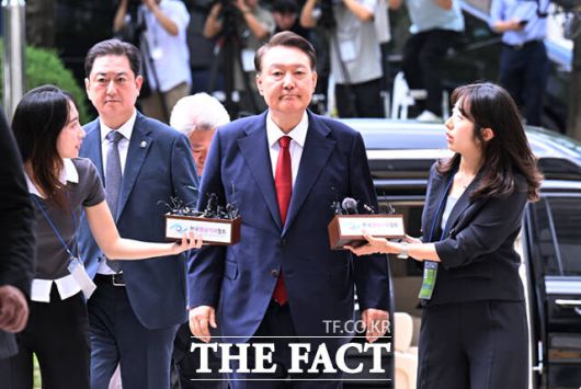 [더팩트ㅣ선은양·송다영 기자] 윤석열 전 대통령이 9일 오후 구속 취소 123일 만에 구속영장실질심사에 출석했다. 윤 전 대통령은 내란 우두머리 혐의 재판 출석 때와 마찬가지로 취재진의 질문에 말없이 법원으로 들어섰다.