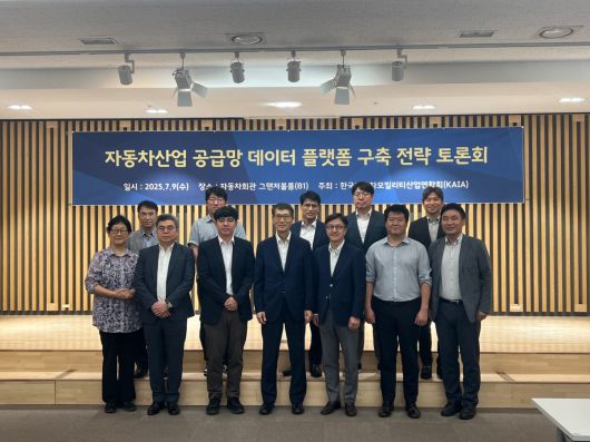 한국자동차모빌리티산업연합회(KAIA)는 9일 자동차회관에서 '자동차산업 공급망 데이터 플랫폼 구축 전략 토론회'를 열었다. 토론회 참석자들이 기념촬영을 하고 있다. |