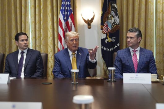 도널드 트럼프 미국 대통령이 마르코 루비오 국무장관(왼쪽)과 피트 헤그세스 국방장관(오른쪽)과 함께 8일(현지시간) 워싱턴 D.C. 백악관에서 열린 내각 회의에서 발언하고 있다. 〈AP 연합뉴스〉 |