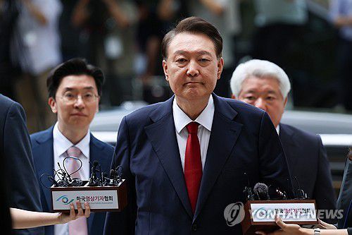 (서울=연합뉴스) 12·3 비상계엄과 관련해 특검의 수사를 받는 윤석열 전 대통령이 9일 서울 서초구 서울중앙지법에서 열린 영장실질심사에 취재진의 질문을 받으며 출석하고 있다. 2025.7.9 [사진공동취재단]
