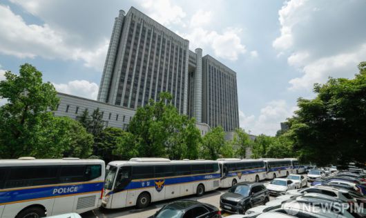 [서울=뉴스핌] 사진공동취재단 = 윤석열 전 대통령의 구속 여부를 가를 구속영장실질 심사가 열리는 9일 서울 서초구 서울중앙지방법원이 경찰 차벽 등으로 경계가 삼엄한 모습을 보이고 있다. 2025.07.09 photo@newspim.com