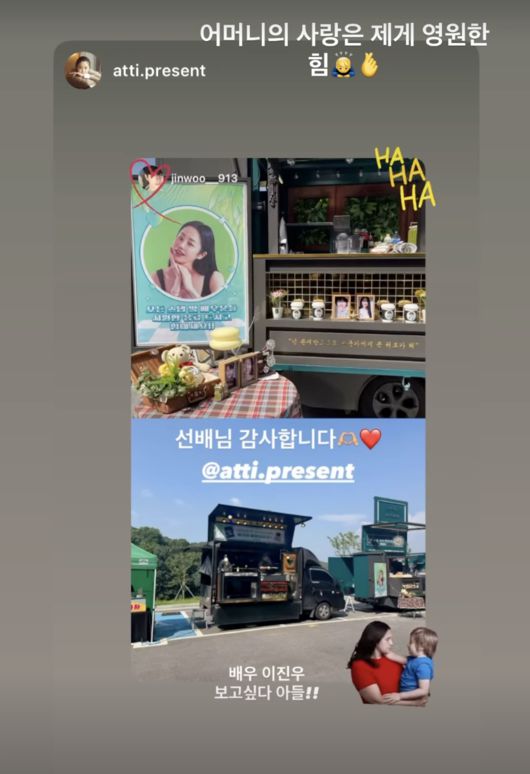 고현정이 보낸 커피차에는 고현정과 이진우의 사진과 함께 “모든 스탭 및 배우분들 시원한 음료 드시고 힘내세요!”라는 멘트가 담겼다. 이진우도 커피를 들고 “덕분에 힘 든든하게”라고 덧붙이며 고마움을 표했다.