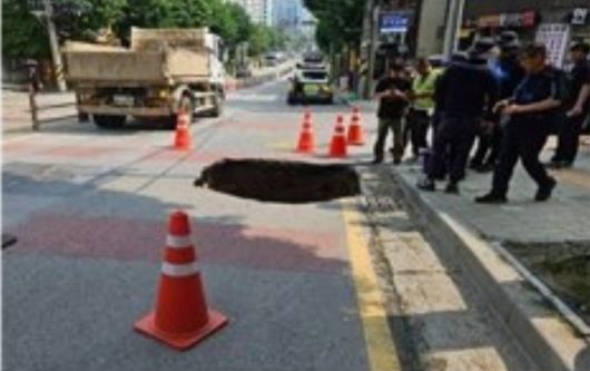 9일 인천 서구와 인천환경공단 등에 따르면 전날 오후 1시 30분쯤 인천시 서구 석남동 염곡로 독골사거리 인근의 한 도로에서 지름 2m, 깊이 2.5m 크기의 땅 꺼짐이 발생했다.