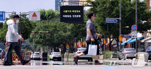 9일 서울 시내 도로 전광판에 '서울지역 폭염경보' 문구가 표출되고 있다. 이날 서울시에 따르면 지난 5월 15일부터 이달 7일까지 병원 응급실에 실려 온열질환자는 총 85명에 이른다. 지난해 같은 기간(27명) 대비 3.15배 늘었다. 서울시는 시내 소재 70개 병원이 참여하는 ‘온열질환 응급실 감시체계’를 운영 중이다. 서울시는 온열질환 응급실 감시체계를 가동하고 야외 작업·신체활동 자제를 당부했다. 2025.7.9/뉴스1 ⓒ News1 박지혜 기자 |