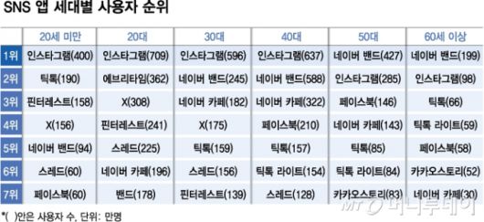 SNS 앱 세대별 사용자 순위/그래픽=김다나 |