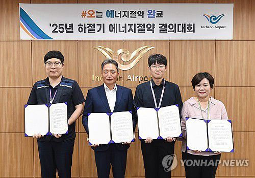 (서울=연합뉴스) 이학재 인천국제공항공사 사장(왼쪽 두 번째) 및 에너지 지킴이 대표들이 9일 인천국제공항공사 대회의실에서 열린 '인천공항 에너지 절약 캠페인'에서 에너지 절약 결의문을 들고 기념 촬영하고 있다. 2025.7.9 [인천국제공항공사 제공. 재판매 및 DB 금지]