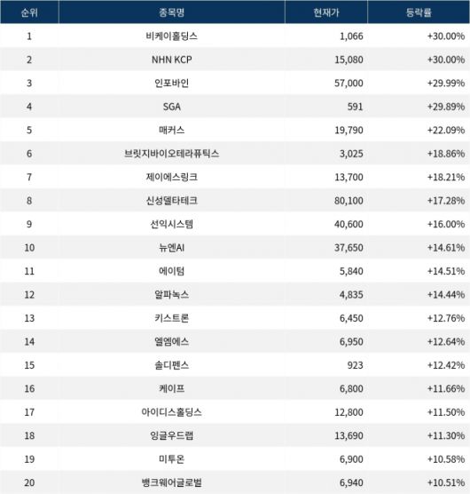이어 상승률 2위 NHN KCP(060250)는 주가가 +30.00% 상승하며 종가 15,080원에 마감했다. 상승률 3위 인포바인(115310)의 주가는 57,000원으로 +29.99% 상승하며 강세를 보였다. 상승률 4위 SGA(049470)는 +29.89% 상승하며 591원에 마감했다. 상승률 5위 매커스(093520)는 +22.09%의 상승세를 타고 종가 19,790원에 마감했다.