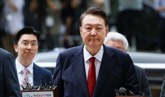 윤석열 전 대통령이 9일 서울 서초구 서울중앙지법에서 열린 영장실질심사에 취재진의 질문을 받으며 출석하고 있다. [사진공동취재단] |