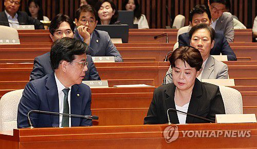 (서울=연합뉴스) 김주형 기자 = 국민의힘 송언석 비상대책위원장 겸 원내대표(왼쪽)와 윤희숙 신임 혁신위원장이 9일 서울 여의도 국회에서 열린 의원총회에서 대화하고 있다. 2025.7.9