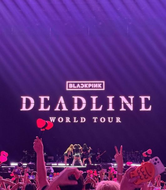 사진 속에는 인파로 가득 찬 공연장과 거대한 'DEADLINE WORLD TOUR' 무대가 인상적으로 펼쳐져 있었다. 무대 위에는 블랙핑크의 네 멤버가 손을 맞잡고 서 있는 뒷모습이 담겼으며, 강렬한 조명과 팬들의 붉은 응원봉이 어우러져 공연의 열기를 더했다.