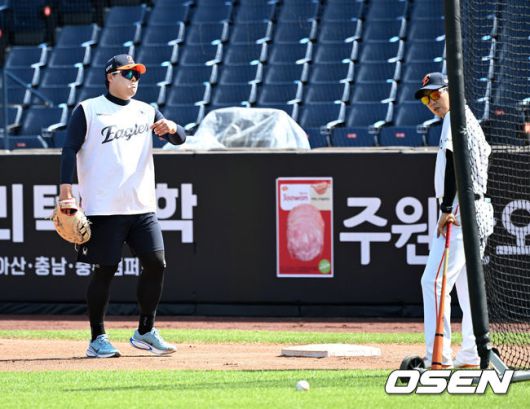 [OSEN=대전, 이대선 기자] 9일 오후 대전 한화생명볼파크에서 2025 신한 SOL Bank KBO리그 한화 이글스와 KIA 타이거즈의 경기가 열렸다. 한화는 문동주, KIA는 양현종 선발로 내세웠다. 경기에 앞서 한화 류현진이 수비 훈련을 돕고 있다. 2025.07.08 /sunday@osen.co.kr