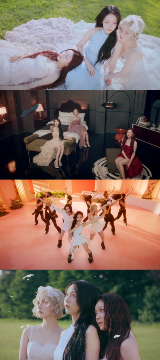 이어지는 장면에서는 모던한 무드의 인테리어 공간 속 세 멤버가 각자의 색을 담은 드레스를 입고 앉아 신비롭고도 고혹적인 분위기를 완성하는가 하면, 댄서들과 함께 반전 매력을 드러내는 파워풀한 안무로 압도적인 존재감을 보여 준다.