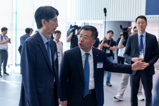 9일 서울 마곡 코엑스에서 산업통상자원부와 대한무역투자진흥공사(KOTRA·코트라)는 '2025 관세대응 수출바우처 플라자'를 개최했다. 사진은 강경성 코트라 사장(오른쪽)이 서가람 산업부 무역정책관과 행사장을 둘러보고 있는 모습./대한무역투자진흥공사 |