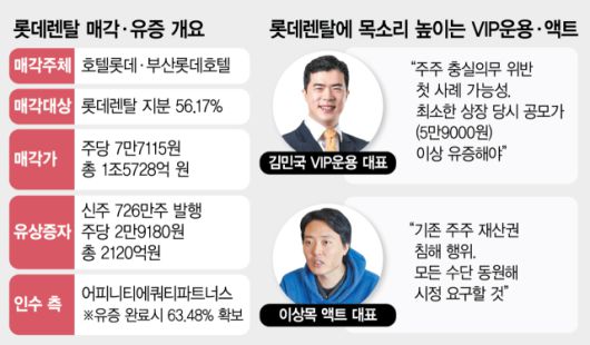 그러나 같은날 롯데렌탈 이사회는 어피니티를 대상으로 신주 726만주를 주당 2만 9180원, 총 2120억 원에 발행하는 유상증자를 결의했다. 대주주 매각가보다 약 62% 낮은 수준이다. 이에 VIP운용과 소액주주들은 자신들의 지분이 희석돼 재산권이 침탈됐다며 불만을 표시하고 나선 것이다. 롯데렌탈 매각·유증 건은 현재 공정위가 진행중인 기업결합심사 절차가 끝나는대로 최종 실행될 예정이다.
