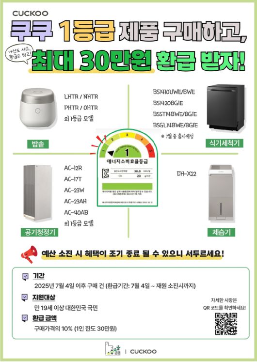 쿠쿠의 제습기, 공기청정기, 식기세척기, 창문형에어컨, 밥솥 등이 으뜸효율 가전제품 환급사업 대상에 포함됐다.
