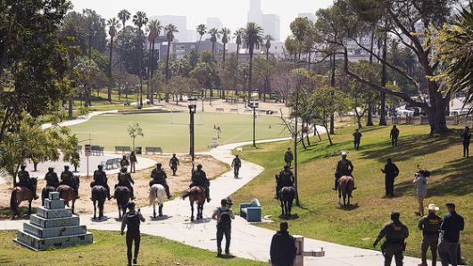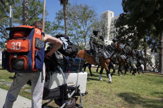 7일(현지시간) AP통신에 따르면 이날 오전 10시 30분께 LA 도심에서 서쪽으로 3.2㎞ 떨어진 맥아더 공원에 군복 차림의 이민 당국 요원들이 모습을 드러냈다. 요원들은 '국경순찰대'와 '국토안보수사국'이라 적힌 군복을 입고 말과 장갑차를 동원했으며 소총과 전술 장비를 갖춘 채 공원을 가로질렀다.