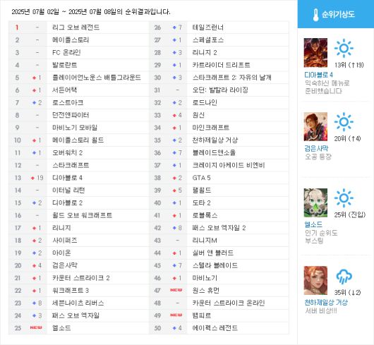 하위권에서는 천하제일상 거상(이하 거상)이 4주 연속 하락하며 28위에서 35위까지 내려왔다. 현재 거상에서 가장 큰 문제는 6월부터 부쩍 심해진 서버 불안으로 인한 접속 오류다. 이에 거상 운영진에서 원인 파악과 수정을 완료했고, 6월 한 달간 발생한 서버 문제에 대한 보상을 제공했다. 그러나 7월 9일에도 유저 다수가 플레이하기가 어려울 정도로 접속이 어렵다고 호소하고 있다. 대대적인 서버 정비가 시급한 때다.
