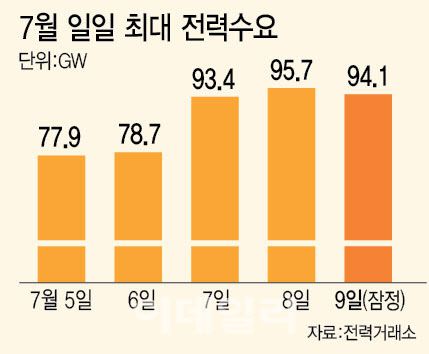 9일 전력거래소에 따르면 이날 오후 한때 최대전력수요는 93.3기가와트(GW)를 기록했다. 전날 7월 기준 역대 최고치를 기록한 95.7GW보다 2.4GW 줄어든 수치이긴 하지만 여전히 높은 수치다.